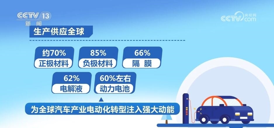 工業(yè)和信息化部表示,我國(guó)已建立了結(jié)構(gòu)完整、有機(jī)協(xié)同的新能源汽車產(chǎn)業(yè)鏈、供應(yīng)鏈體系,涵蓋基礎(chǔ)材料、零部件、整車、制造裝備等全鏈條,生產(chǎn)供應(yīng)了全球約70%的正極材料、85%的負(fù)極材料、66%的隔膜、62%的電解液以及60%左右的動(dòng)力電池,為全球汽車產(chǎn)業(yè)電動(dòng)化轉(zhuǎn)型注入了強(qiáng)大動(dòng)能。