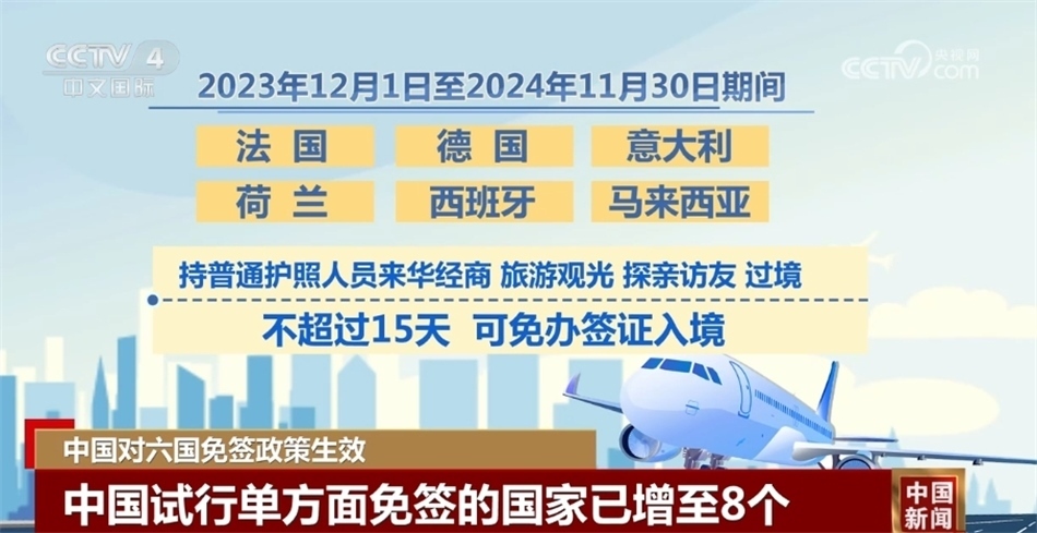 2023年12月1日至2024年11月30日期間,法國(guó)、德國(guó)、意大利、荷蘭、西班牙、馬來(lái)西亞6個(gè)國(guó)家持普通護(hù)照人員來(lái)華經(jīng)商、旅游觀光、探親訪友和過(guò)境不超過(guò)15天,可免辦簽證入境。至此,我國(guó)試行單方面免簽的國(guó)家從原先2個(gè)(文萊、新加坡)增加至8個(gè),覆蓋國(guó)家也從亞洲擴(kuò)大至歐洲。