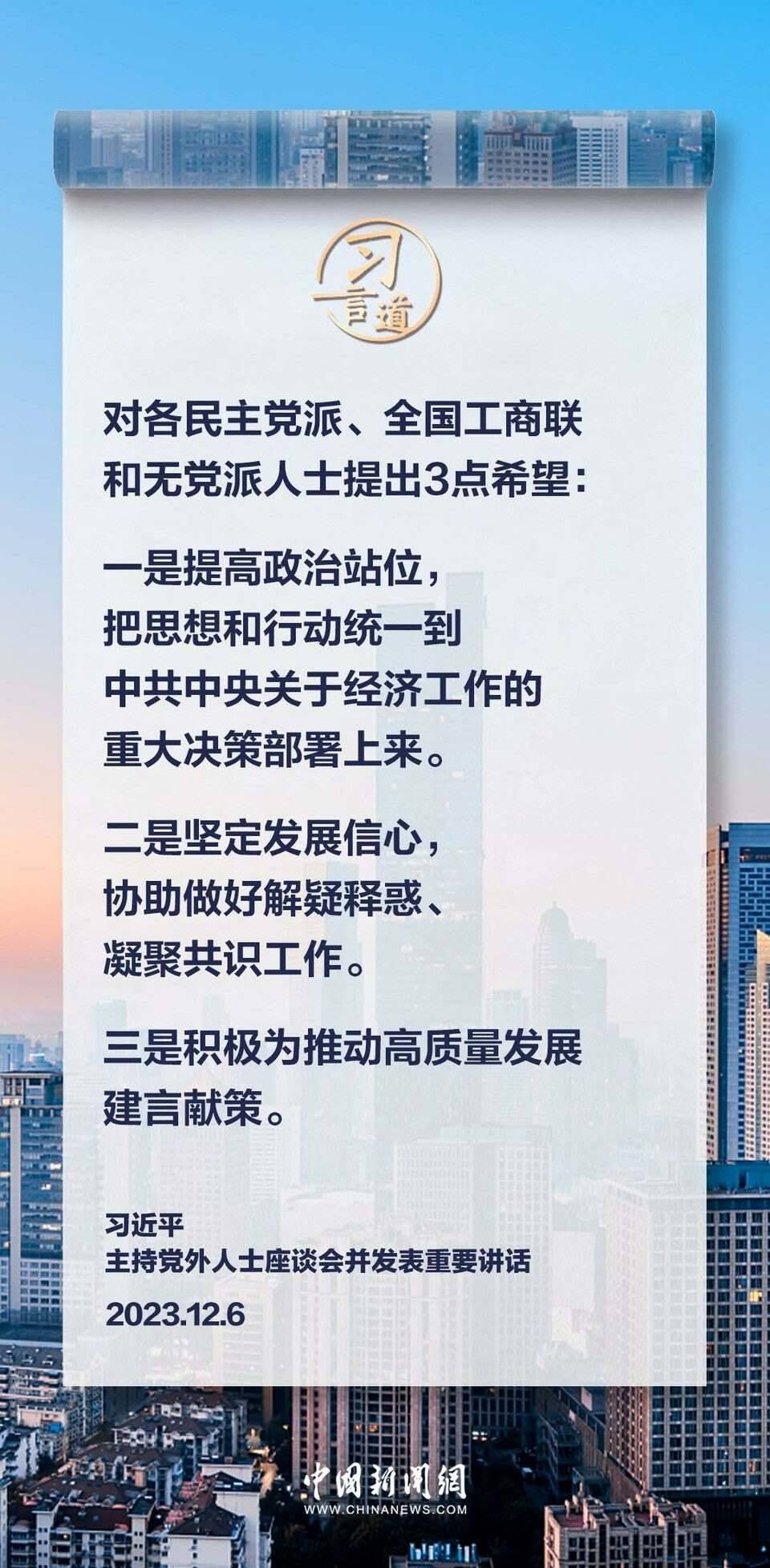 12月6日,中共中央在中南海召開(kāi)黨外人士座談會(huì),就今年經(jīng)濟(jì)形勢(shì)和明年經(jīng)濟(jì)工作聽(tīng)取各民主黨派中央、全國(guó)工商聯(lián)負(fù)責(zé)人和無(wú)黨派人士代表的意見(jiàn)和建議。中共中央總書(shū)記習(xí)近平主持座談會(huì)并發(fā)表重要講話(huà)。