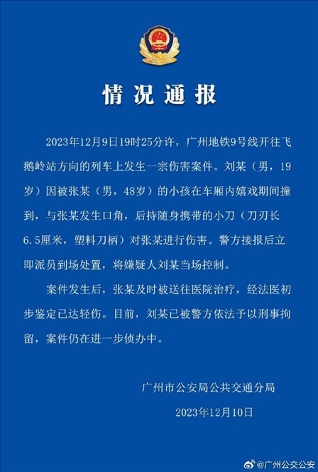 ·警方通報(bào)“廣州地鐵9號(hào)線持刀傷人事件”,廣州地鐵回應(yīng):涉案刀具不在管制范圍內(nèi)。