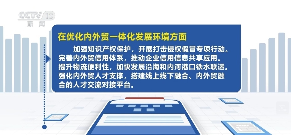 在優(yōu)化內(nèi)外貿(mào)一體化發(fā)展環(huán)境方面,加強(qiáng)知識(shí)產(chǎn)權(quán)保護(hù),開展打擊侵權(quán)假冒專項(xiàng)行動(dòng)。完善內(nèi)外貿(mào)信用體系,推動(dòng)企業(yè)信用信息共享應(yīng)用。提升物流便利性,加快發(fā)展沿海和內(nèi)河港口鐵水聯(lián)運(yùn)。強(qiáng)化內(nèi)外貿(mào)人才支撐,搭建線上線下融合、內(nèi)外貿(mào)融合的人才交流對(duì)接平臺(tái)。