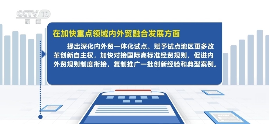在加快重點(diǎn)領(lǐng)域內(nèi)外貿(mào)融合發(fā)展方面,提出深化內(nèi)外貿(mào)一體化試點(diǎn)。賦予試點(diǎn)地區(qū)更多改革創(chuàng)新自主權(quán),加快對(duì)接國際高標(biāo)準(zhǔn)經(jīng)貿(mào)規(guī)則,促進(jìn)內(nèi)外貿(mào)規(guī)則制度銜接,復(fù)制推廣一批創(chuàng)新經(jīng)驗(yàn)和典型案例。