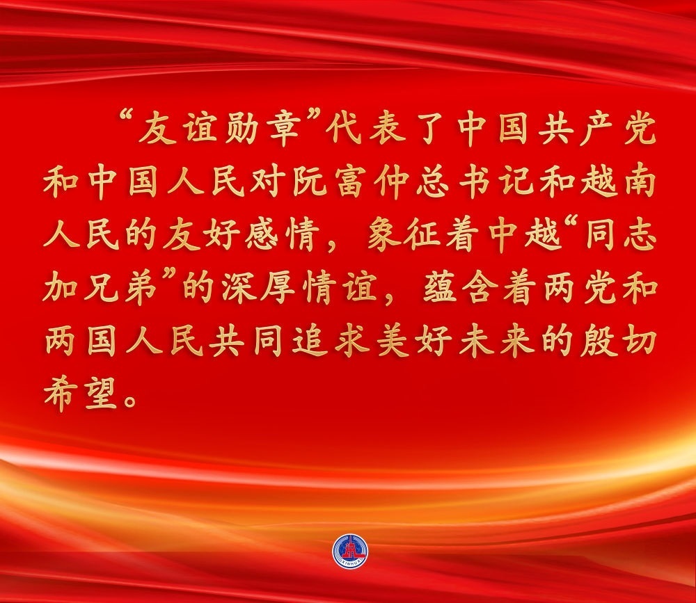 2022年10月31日,中共中央總書記、國家主席習近平在北京人民大會堂向越共中央總書記阮富仲授予中華人民共和國“友誼勛章”,并舉行隆重頒授儀式。
