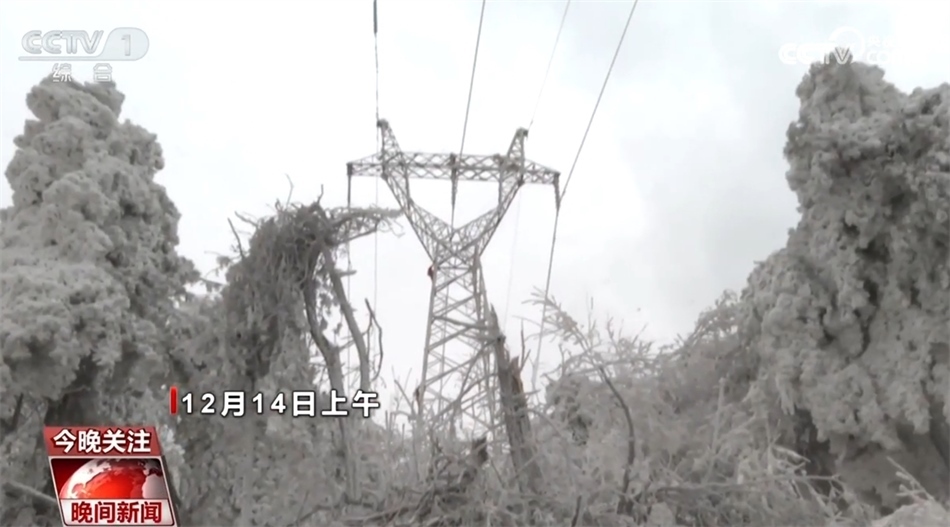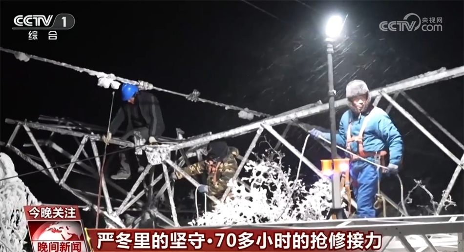 總臺記者 崔肖冉:這里的海拔超過1200米,現(xiàn)在室外氣溫降至零下20℃,感覺進(jìn)入了一個(gè)冰窖。我在室外大概走上15分鐘左右,就感覺整個(gè)關(guān)節(jié)凍得發(fā)疼,而此時(shí)此刻在距離地面大概20多米的高空,維修人員正在輸電線路上進(jìn)行緊急搶修,而且今天晚上風(fēng)很大,可想而知搶修難度有多大。