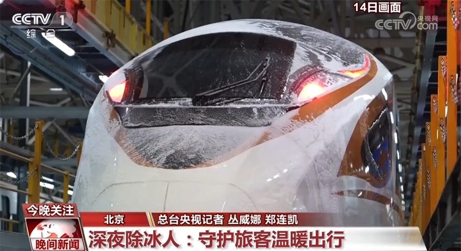 持續(xù)的雨雪冰凍天氣不僅影響公路安全,也對高鐵動(dòng)車運(yùn)行造成一定影響。晚上11點(diǎn),在北京西和雄安站間運(yùn)行一天的C2727次列車完成任務(wù),入庫檢修,車頭上頂著厚厚的冰塊。