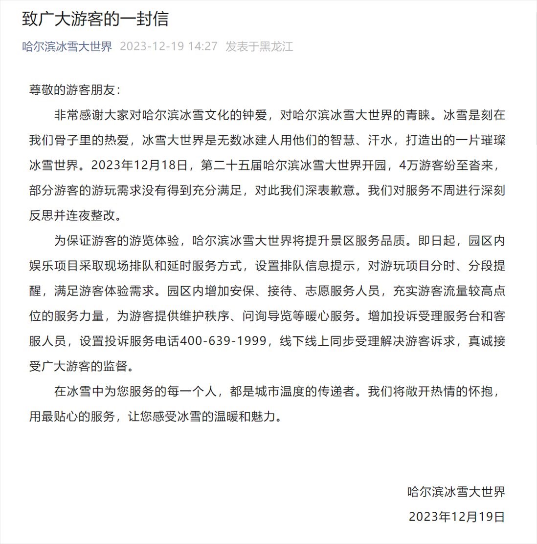 ·哈爾濱冰雪大世界開園首日被喊退票,園區(qū)發(fā)文致歉:連夜整改。當(dāng)?shù)匚穆镁只貞?yīng)已去現(xiàn)場(chǎng)督導(dǎo)。