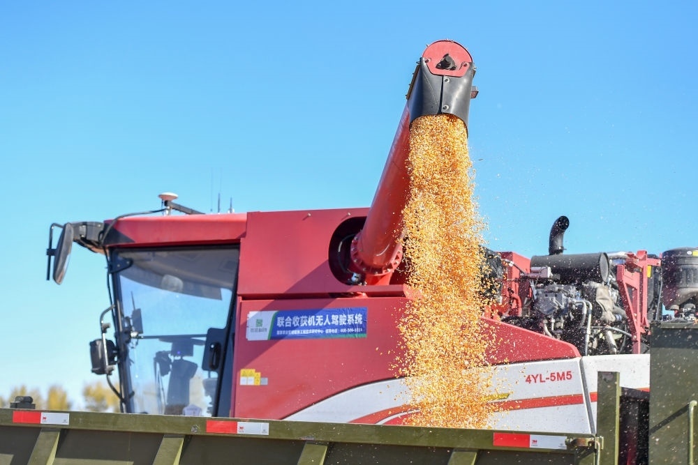 在中國科學(xué)院“黑土糧倉”科技會(huì)戰(zhàn)長春示范區(qū)公主嶺示范基地,無人駕駛農(nóng)機(jī)將收獲的玉米裝車(2023年10月19日攝)。新華社記者 張楠 攝