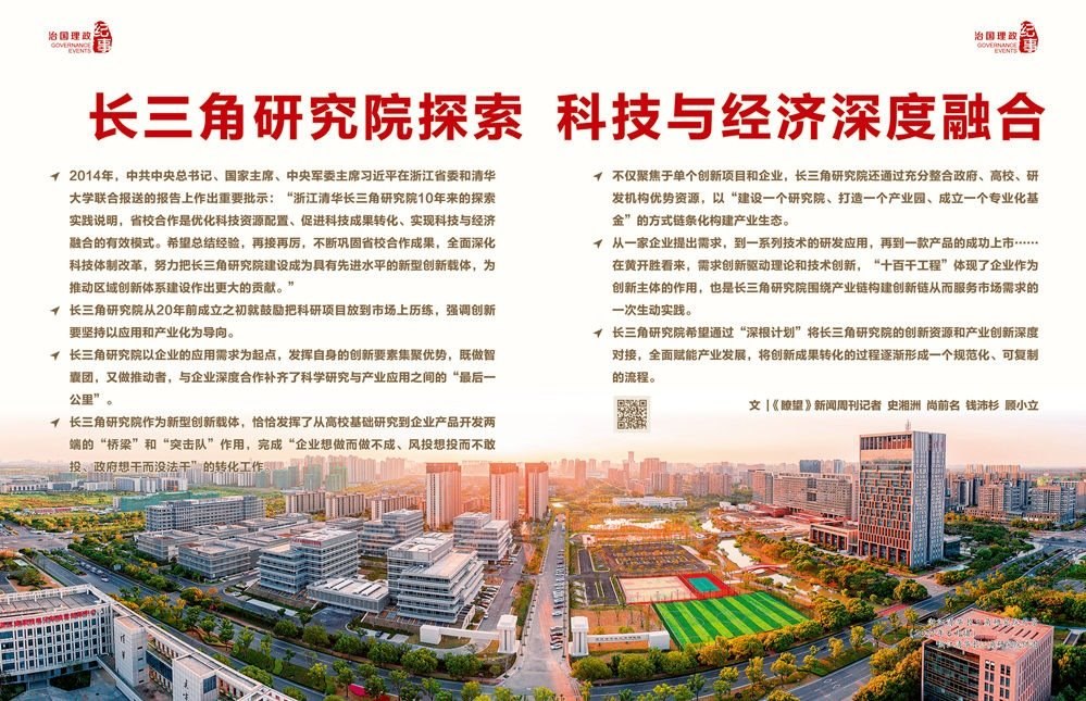 2003年底,在時任浙江省委書記習(xí)近平的親自推動下,浙江清華長三角研究院(以下簡稱“長三角研究院”)正式成立,落地浙江嘉興。作為浙江省人民政府與清華大學(xué)共建的新型創(chuàng)新載體,長三角研究院成立以來立足浙江、面向長三角,以自收自支、市場化運(yùn)營探索走出一條省校合作的有效模式,逐步成長為長三角區(qū)域重要的產(chǎn)學(xué)研試驗(yàn)平臺和成果轉(zhuǎn)化基地。