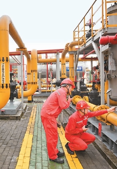 在位于重慶涪陵的中國(guó)首個(gè)投入商業(yè)開發(fā)頁(yè)巖氣田——涪陵頁(yè)巖氣田白濤集輸站,技術(shù)人員對(duì)設(shè)備進(jìn)行巡檢。新華社記者 王全超攝