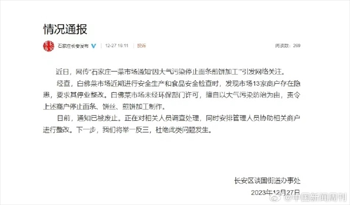 ·石家莊一菜市場通知“因大氣污染停止面條煎餅加工”?官方回應。