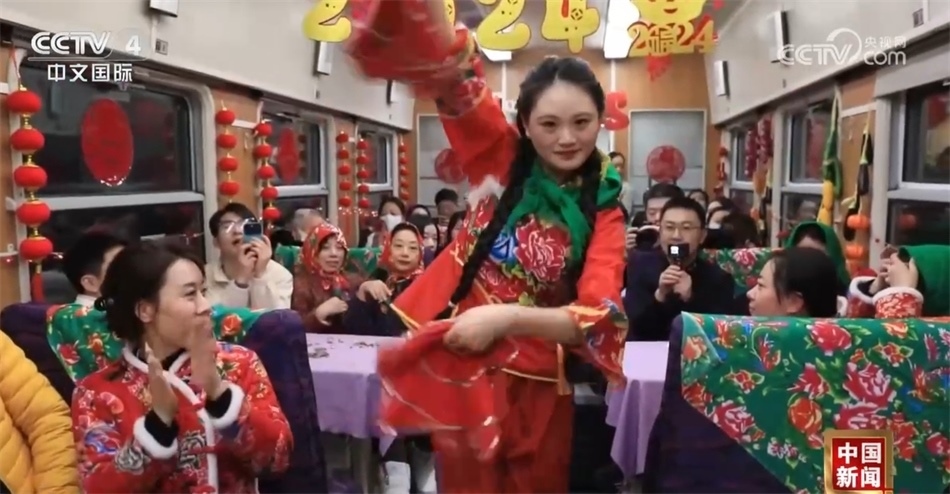 跟著游客,我現在到了一節(jié)互動車廂,這里被布置成“跨年狂歡”的主題場景,在這里游客可以體驗剪窗花、包餃子、穿東北大花襖一系列特色活動,現在就有很多游客在這里打卡拍照。
