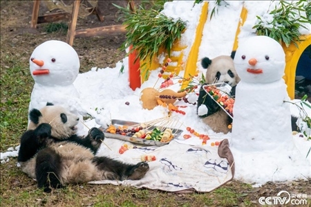 重慶動(dòng)物園,大熊貓“渝可”“渝愛”在雪中擼串,享受新年美好時(shí)光。