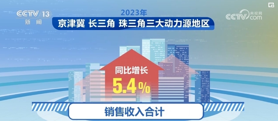 2023年,京津冀、長三角、珠三角三大動力源地區(qū)經(jīng)濟總體呈現(xiàn)較快發(fā)展態(tài)勢,銷售收入合計同比增長5.4%,占全國比重提高至54.1%,較2022年提高0.3個百分點,帶動作用持續(xù)增強。