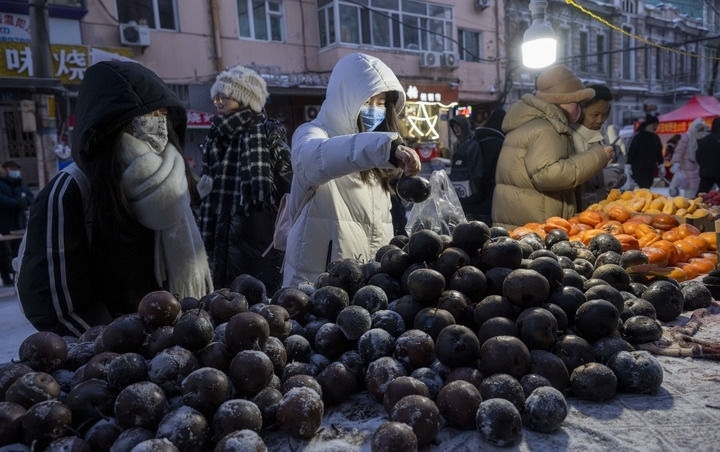 ?2024年1月22日,在黑龍江哈爾濱紅專街早市,游客挑選凍梨和凍柿子。新華社記者 才揚 攝