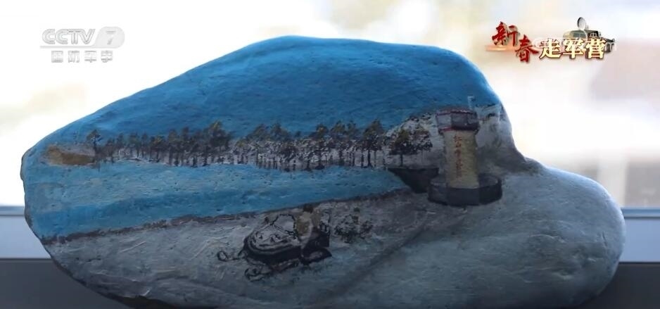 新疆軍區(qū)紅山嘴邊防連 段昱恒:我畫的這塊石頭,這里是我們紅山嘴邊防連的一個(gè)哨樓,這里是我們一起來(lái)的6名新兵,從哨樓出來(lái)準(zhǔn)備去巡邏,前方有冰河,有雪山。在這里我還畫了一條龍,新的一年是龍年,我也希望大家龍馬精神,見龍皆是福。