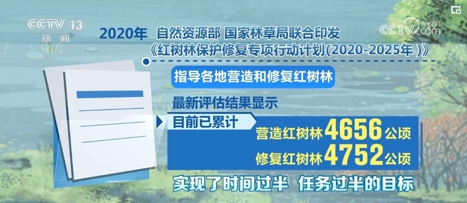 2020年,自然資源部、國家林草局聯(lián)合印發(fā)《紅樹林保護修復專項行動計劃(2020—2025年)》,指導各地營造和修復紅樹林。最新評估結果顯示,目前,已累計營造紅樹林4656公頃,修復紅樹林4752公頃,實現(xiàn)了時間過半、任務過半的目標。