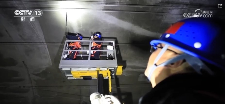 兩個(gè)8米高的作業(yè)平臺(tái),10公斤重的敲擊桿,在與隧道壁的撞擊聲和作業(yè)車(chē)的風(fēng)笛聲中,高鐵橋隧工們開(kāi)始了工作。