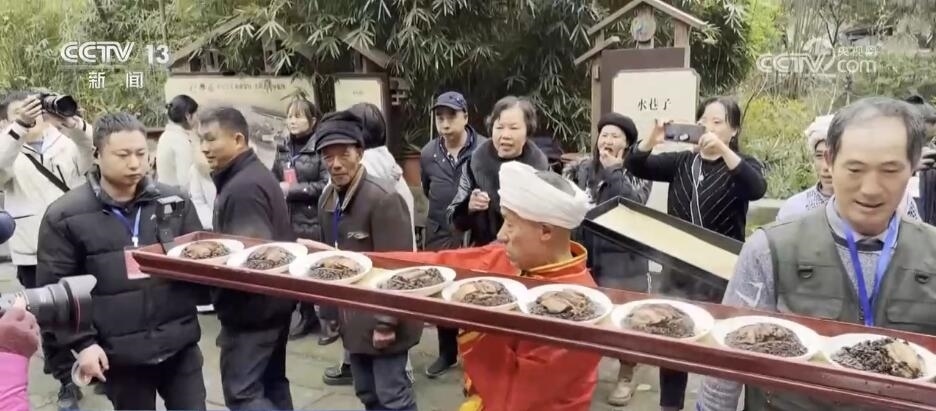 在熱鬧的現(xiàn)場,最引人注目的就是“打盆”絕技,這也是川渝地區(qū)獨有的民俗上菜表演。四層高的蒸籠冒著熱氣,民間藝人將蒸籠里的菜肴放在一個長2米、寬20厘米的木托盤里,將其頂在頭上,不用手扶,傳送到長桌宴上。