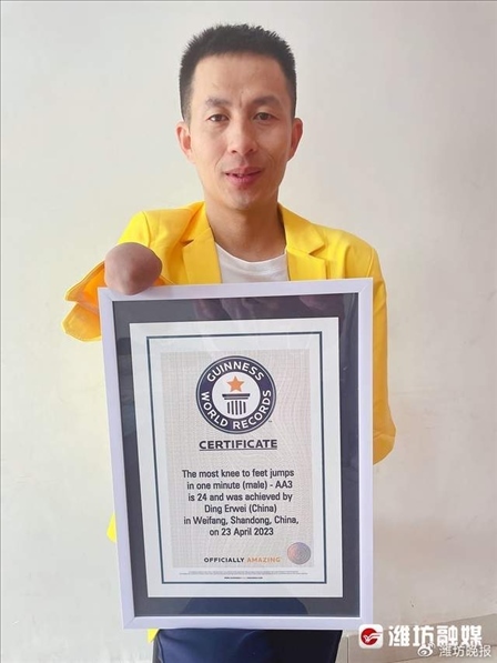 山東濰坊,42歲的丁二偉在8歲時(shí),因?yàn)檎{(diào)皮摸了村里的變壓器造成雙臂截肢。他當(dāng)了11年殘疾人長跑運(yùn)動(dòng)員,退役已經(jīng)有10年了。2日,他收到吉尼斯總部寄來的證書,挑戰(zhàn)的項(xiàng)目是一分鐘跪跳起,他一分鐘跳了24個(gè),是跪跳起跳得最多的人。