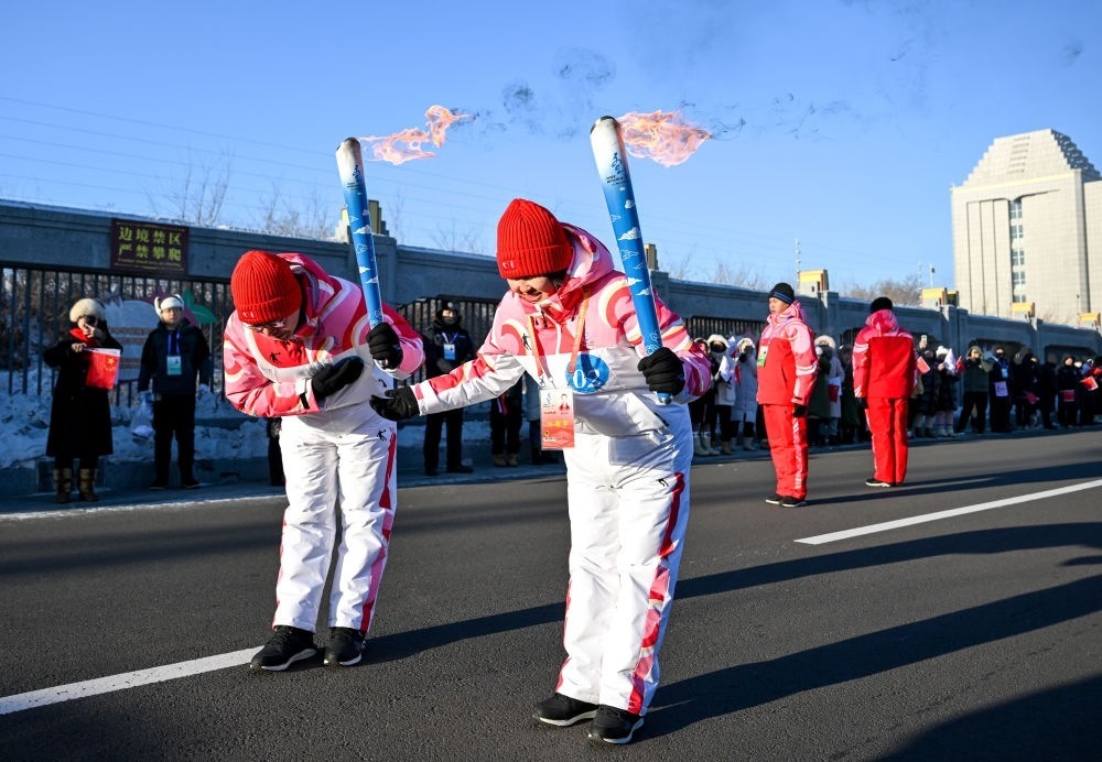 ??2月3日,在內蒙古呼倫貝爾市滿洲里國門景區(qū),火炬手包玲玲(右)和錢卓在火炬?zhèn)鬟f活動中。新華社記者 連振 攝