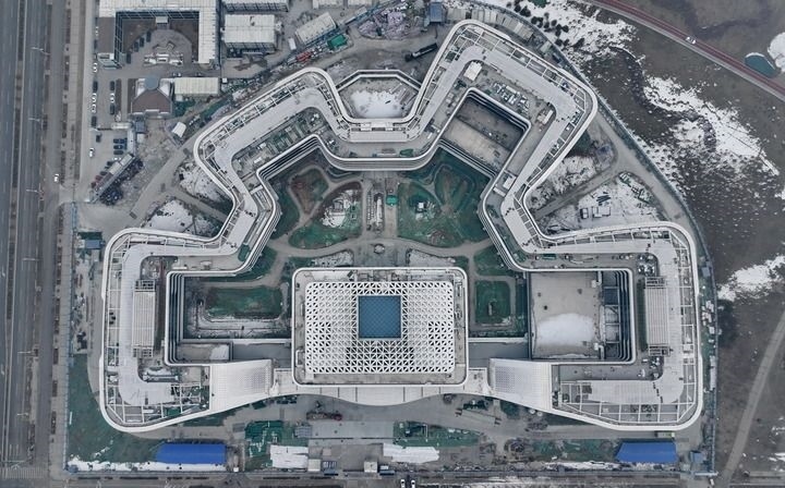 這是位于雄安新區(qū)啟動區(qū)內(nèi)的中國衛(wèi)星網(wǎng)絡(luò)集團(tuán)有限公司總部大樓建設(shè)現(xiàn)場(2024年1月31日攝,無人機(jī)照片)。新華社記者 牟宇 攝