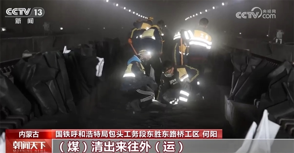 國鐵呼和浩特局包頭工務段東勝東路橋工區(qū) 何陽:這塊就已經(jīng)(堆)積得相當厚了,咱們今天必須抓緊時間把這個清出來,煤清出來往外運,要不然后面影響貨車正常通行。