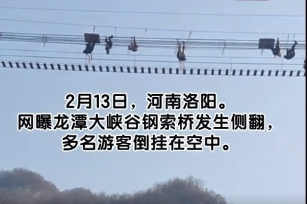 ·洛陽一景區(qū)鋼索橋側(cè)翻多名游客倒掛空中。景區(qū):可能游客自己晃動導致,已全部救下。