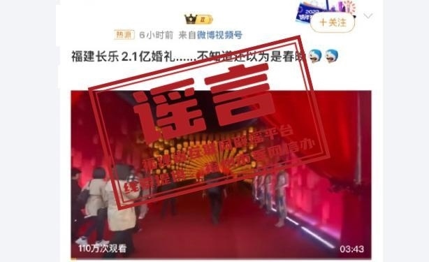 ·福建省互聯(lián)網(wǎng)辟謠平臺:“董事長之子婚宴斥資2.1億”嚴重失實,相關賬號禁言30日。