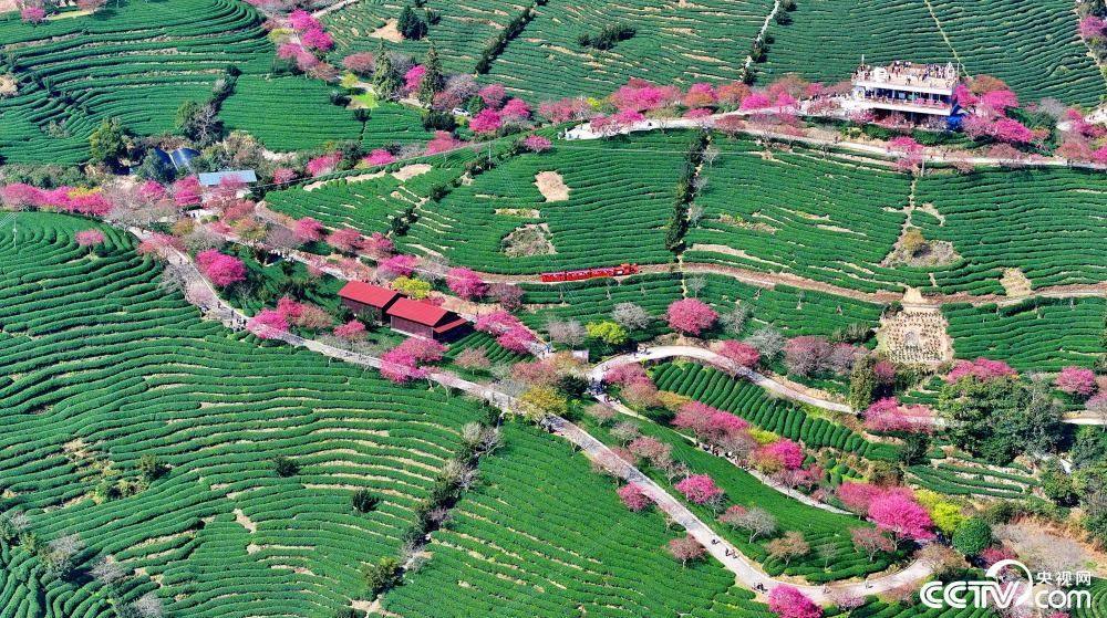 ??2024年2月13日,福建省龍巖市漳平市永福鎮(zhèn)后孟村,茶園櫻花綻放,構成一幅春意盎然的多彩畫卷。?