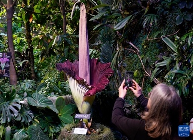 美國舊金山加州科學博物館內一株開花的巨魔芋吸引大批游客觀賞。巨魔芋原產(chǎn)于印度尼西亞蘇門答臘島的熱帶雨林,每隔7至10年開花一次,每次開花時間只有24至36個小時。