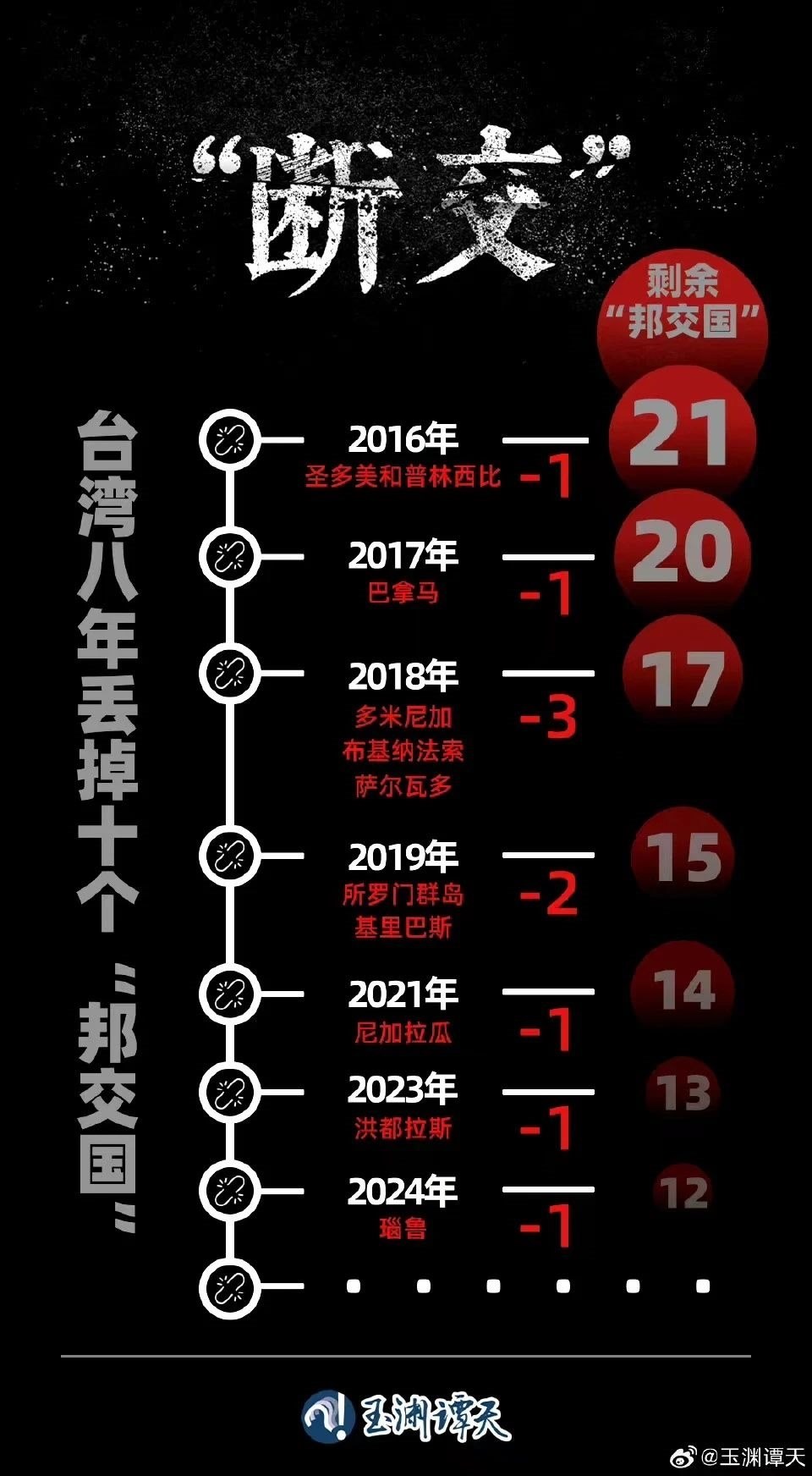 1月,太平洋島國瑙魯宣布與臺灣當局“斷交”,至此,8年“斷交”10國,臺灣當局所謂“邦交國”只剩下12個。而危地馬拉等國也都釋放出要跟臺灣當局“斷交”的信號。