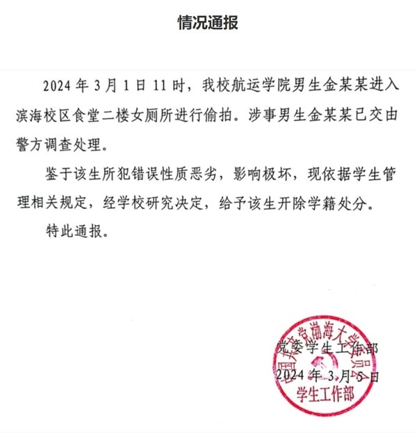 ·渤海大學(xué)一男生進(jìn)入食堂女廁偷拍,被開除學(xué)籍。