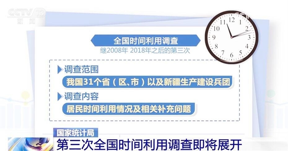 此次全國時間利用調(diào)查是繼2008年、2018年之后的第三次,調(diào)查范圍包括我國31個?。▍^(qū)、市)以及新疆生產(chǎn)建設兵團,調(diào)查的內(nèi)容為居民時間利用情況及相關補充問題。