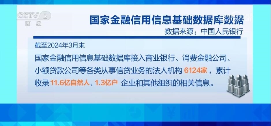 截至2024年3月末,國家金融信用信息基礎數(shù)據(jù)庫接入商業(yè)銀行、消費金融公司、小額貸款公司等各類從事信貸業(yè)務的法人機構(gòu)6124家,累計收錄11.6億自然人、1.3億戶企業(yè)和其他組織的相關信息。