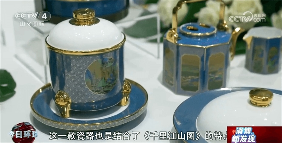江西省景德鎮(zhèn)市商務(wù)局工作人員章少聰介紹稱:“這一幅畫(huà)是北宋王希孟先生創(chuàng)作的,叫作《千里江山圖》。這一款瓷器也是結(jié)合了《千里江山圖》的特點(diǎn),把中國(guó)傳統(tǒng)畫(huà)中的山水、花鳥(niǎo)都完全在瓷器上面展現(xiàn)出來(lái)?!?/p>