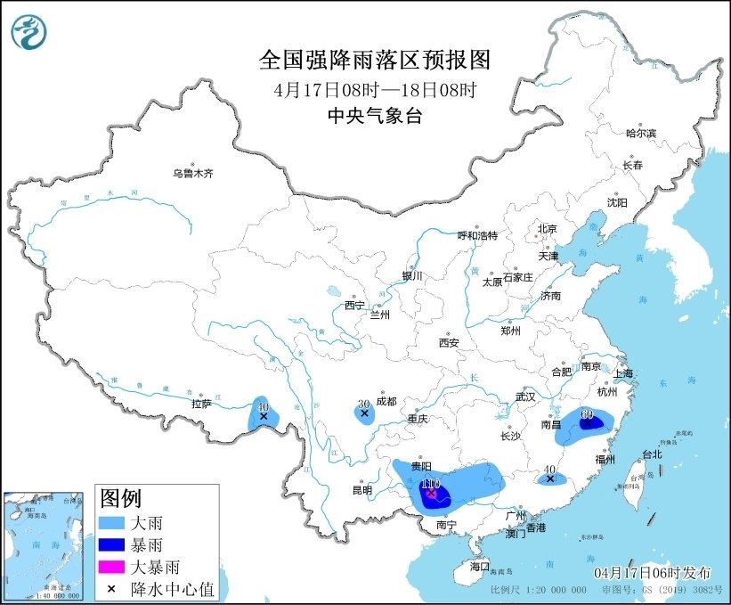 預(yù)計(jì),4月17日08時(shí)至18日08時(shí),江西中北部、浙江南部、福建西北部、四川盆地西南部、貴州東南部、廣西中北部、廣東北部等地部分地區(qū)有大到暴雨,其中,廣西西部等地局地有大暴雨(100~110毫米)。上述部分地區(qū)伴有短時(shí)強(qiáng)降水(最大小時(shí)降雨量30~60毫米,局地可超過70毫米),局地有雷暴大風(fēng)等強(qiáng)對(duì)流天氣。