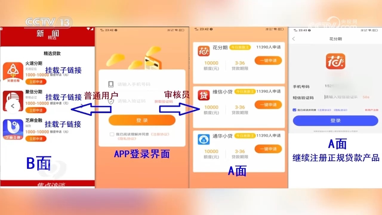 安徽省蕪湖市公安局經(jīng)開區(qū)分局偵查打擊部警務(wù)技術(shù)二級(jí)主管高陽(yáng):“提供審核的都是正規(guī)的貸款產(chǎn)品,點(diǎn)擊以后一步一步看起來(lái)都很正規(guī),這樣審核員就會(huì)通過(guò),覺(jué)得這個(gè)APP是正常的,可以在官方應(yīng)用商城上架。但是普通用戶登錄以后,就會(huì)下載新的APP,新的APP都是詐騙APP。”