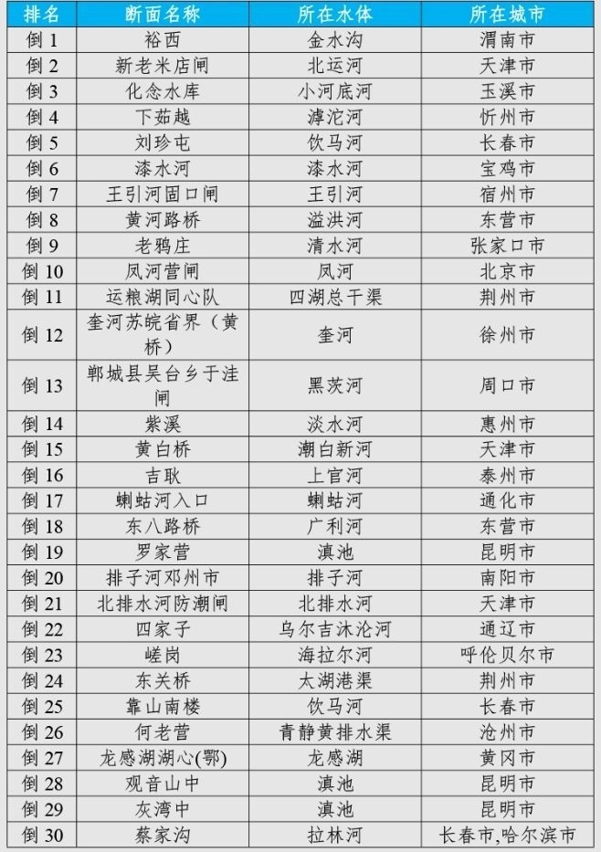 咸陽市泔河入涇河、朝陽市大凌河西支入河口和綏化市/黑河市通肯河大橋等30個國家地表水考核斷面水環(huán)境質(zhì)量變化情況相對較好(從第1名至第30名),渭南市裕西、天津市新老米店閘和玉溪市化念水庫等30個國家地表水考核斷面水環(huán)境質(zhì)量變化情況相對較差(從倒數(shù)第1名至倒數(shù)第30名)。