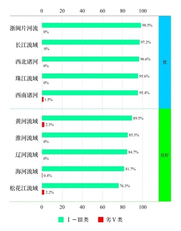 1—3月,長江、黃河、珠江、松花江、淮河、海河、遼河等七大流域及西北諸河、西南諸河和浙閩片河流水質(zhì)優(yōu)良(Ⅰ—Ⅲ類)斷面比例為91.5%,同比上升1.2個百分點;劣Ⅴ類斷面比例為0.5%,同比上升0.1個百分點。主要污染指標為化學需氧量、高錳酸鹽指數(shù)和氨氮。其中,長江流域、珠江流域、浙閩片河流、西北諸河和西南諸河水質(zhì)為優(yōu);黃河流域、松花江流域、淮河流域、海河流域和遼河流域水質(zhì)良好。