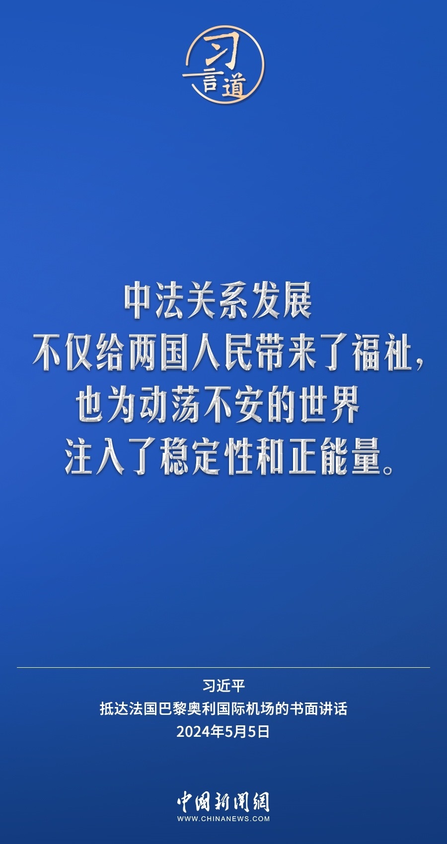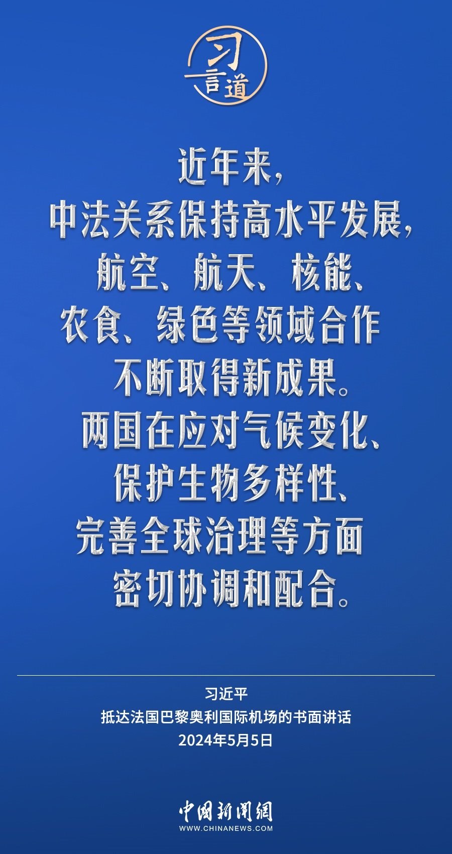 當(dāng)?shù)貢r(shí)間5月5日下午,國家主席習(xí)近平抵達(dá)巴黎,開始對(duì)法國進(jìn)行國事訪問。在抵達(dá)法國巴黎奧利國際機(jī)場的書面講話中,習(xí)近平指出——