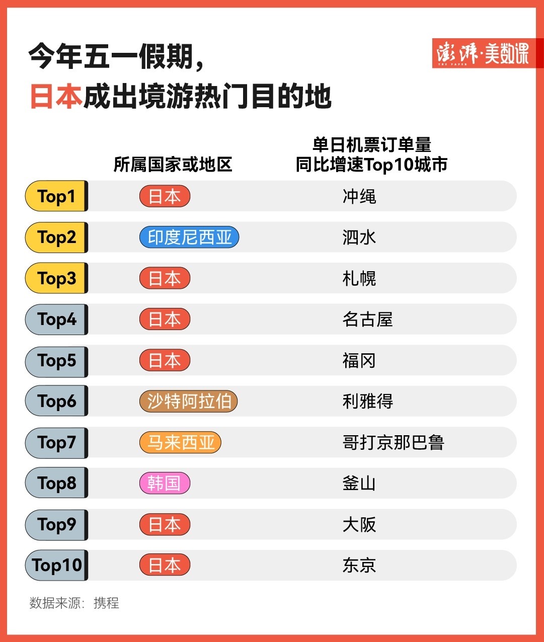 除了國內旅游市場的火爆之外,“五一”出境游已經(jīng)加快復蘇。從攜程提供的數(shù)據(jù)看,今年“五一”假期,日本成了出境游熱門目的地——相比2023年同期,單日機票訂單量同比增速Top10的城市中,日本的沖繩、札幌、名古屋等城市分別占據(jù)了六個席位。
