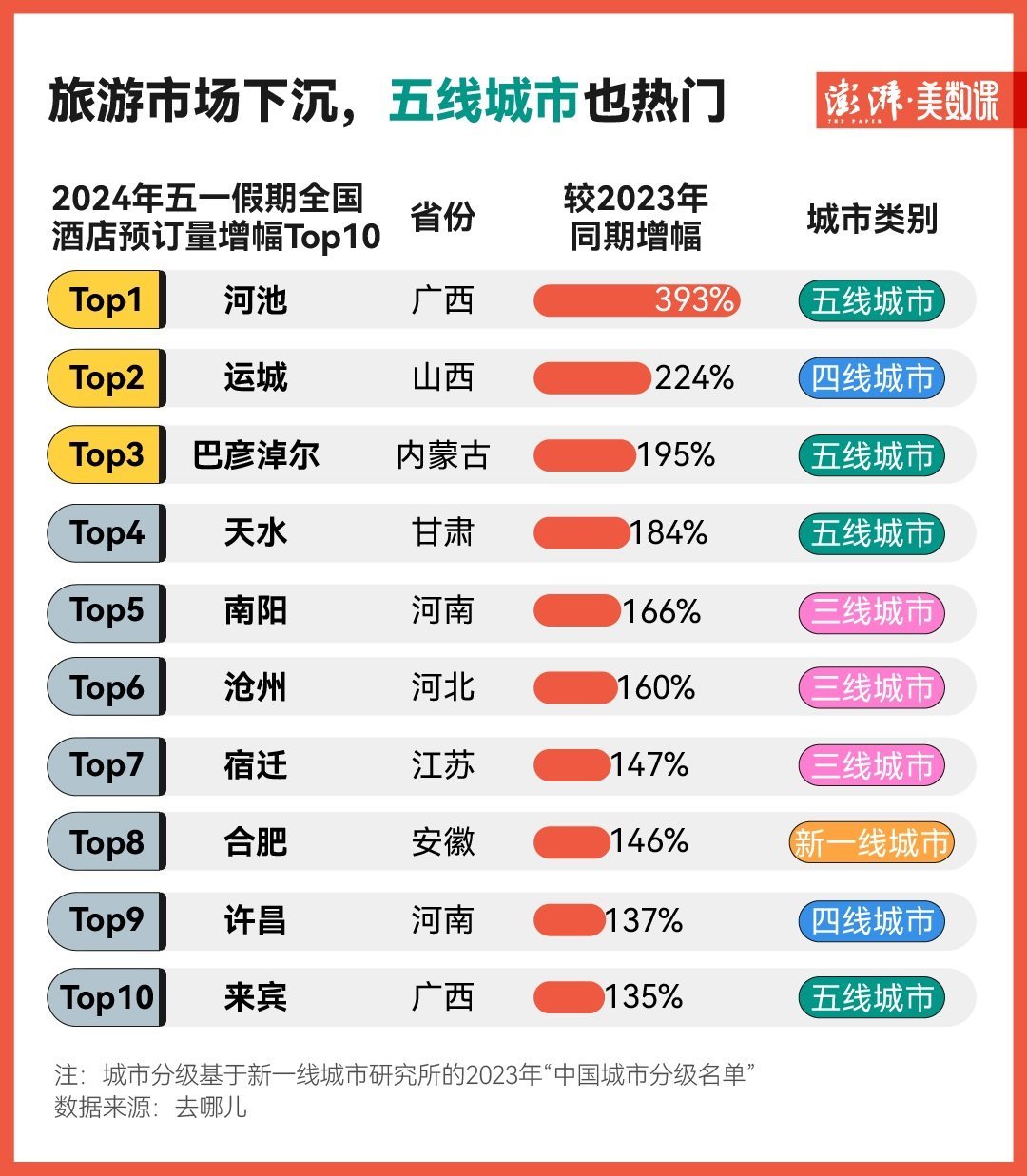 而此前因麻辣燙頻繁沖上熱搜的甘肅天水,在這個五一假期也迎來了不少的食客。相比2023年同期,甘肅天水的五一酒店預訂量漲了184%。