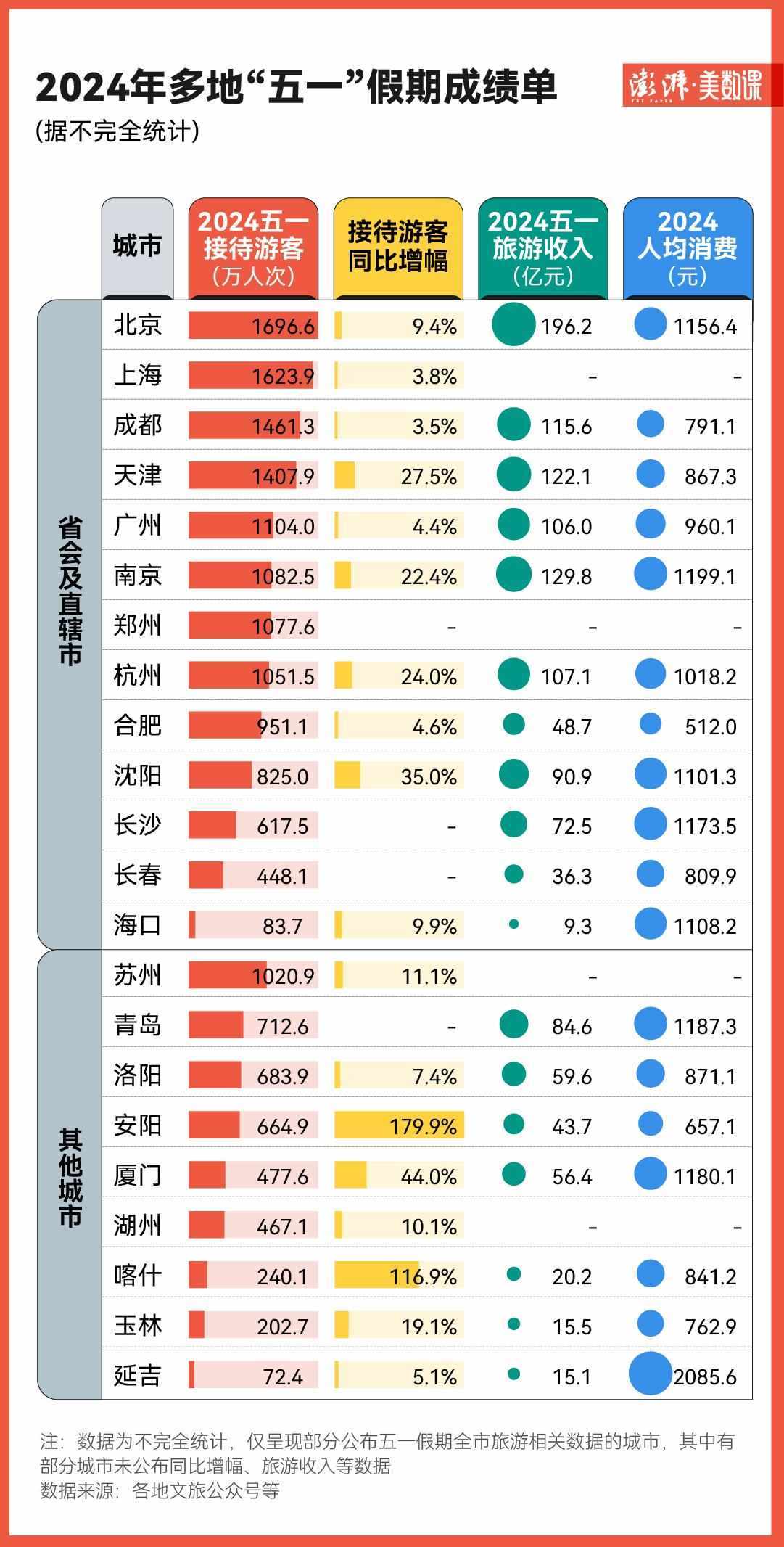 不過,像是北京、上海、成都、天津等城市依然是熱門的旅游目的地。在目前已公布“五一”假期數(shù)據(jù)的省會及直轄市中,北京、上海就以1696.6萬、1623.9萬接待游客人次名列前茅。