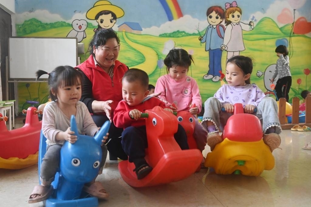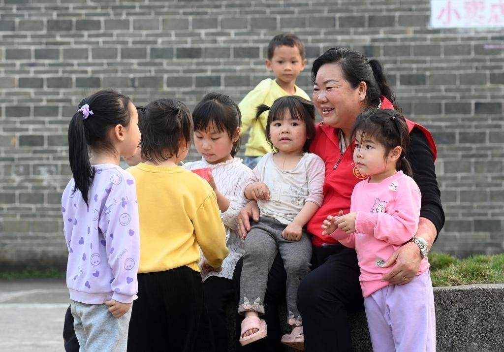 ?↑在廣西賓陽縣中華鎮(zhèn)的一個“留守兒童之家”,張清秀和孩子們一起玩耍(2024年3月5日攝)。