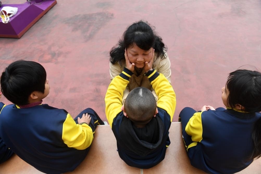 ?↑在廣西南寧高新區(qū)龍華學(xué)校,何冬艷和她照顧的孤獨癥學(xué)生在一起(2023年3月31日攝)。
