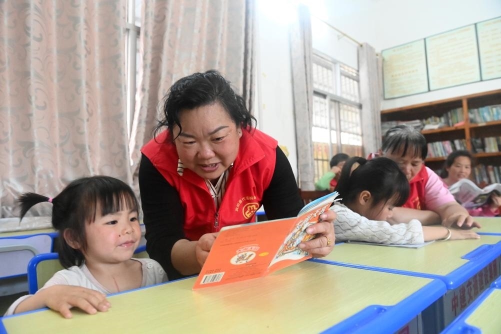 ?↑在廣西賓陽縣中華鎮(zhèn)的一個“留守兒童之家”,張清秀(左二)陪小朋友閱讀(2024年3月5日攝)。