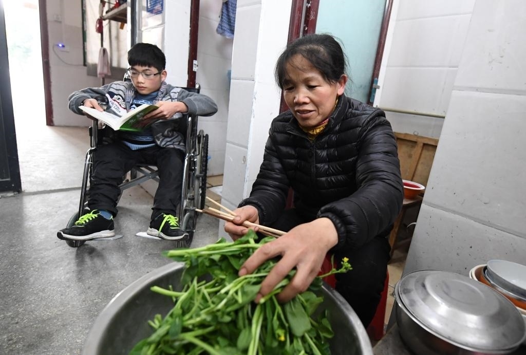 黃必華到縣城上高中后,黃乜鮮住到學(xué)校給他們母子倆免費提供的宿舍里,每天背兒子到教室上課,照顧兒子的生活,空閑時在學(xué)校小賣部打零工賺點生活費。