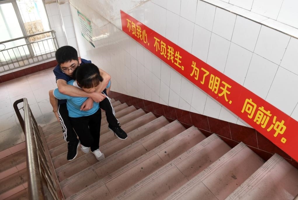 ?↑在廣西東蘭縣高級中學(xué),黃乜鮮背著兒子黃必華前往6樓的教室(2020年5月9日攝)。
