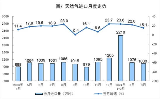 1—4月份,規(guī)上工業(yè)天然氣產(chǎn)量830億立方米,同比增長5.0%。進口天然氣4300萬噸,同比增長20.7%。