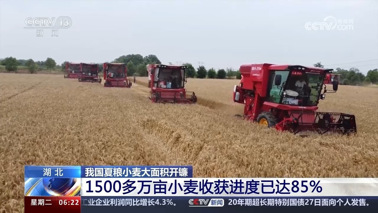 記者從湖北省農(nóng)業(yè)農(nóng)村廳了解到,截至5月26日,湖北省1500多萬畝小麥?zhǔn)斋@進度達85%。
